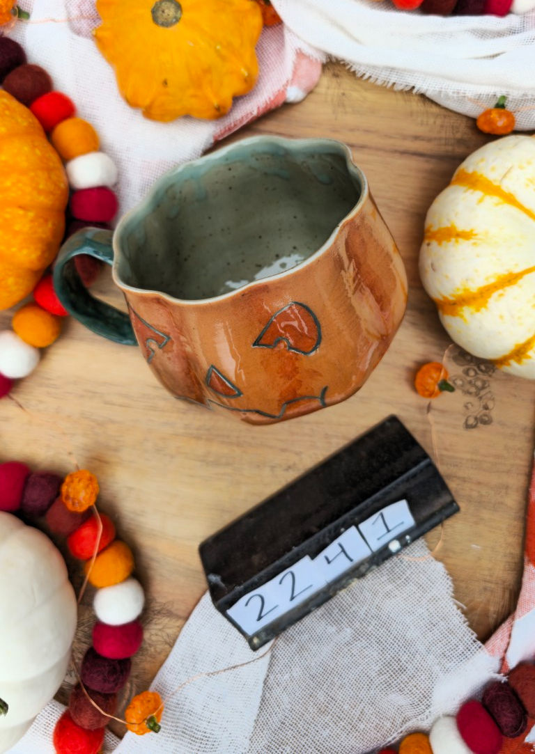 Orange Jack O Lantern Mug with Pinched Handle #2241